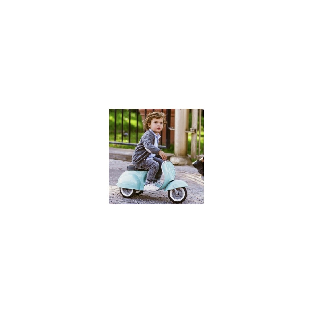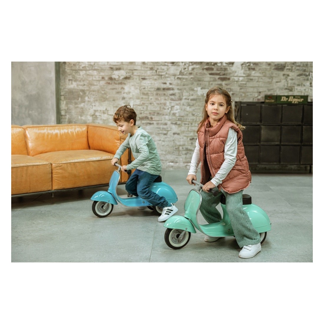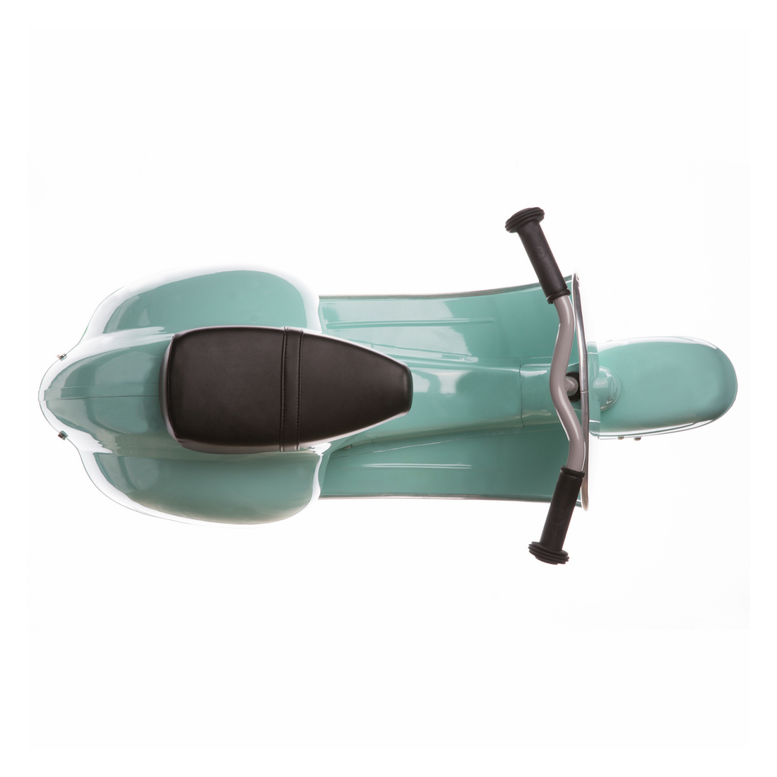Diseño Retro y Elegante: Inspirada en las clásicas Vespas, esta moto correpasillos menta destaca por sus acabados cuidados y detalles realistas que la hacen única. Es ideal para niños y niñas.