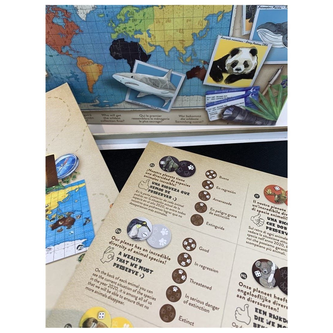 Viajes por los continentes para rescatar especies en peligro mediante fichas de animales distribuidas en el mapa.