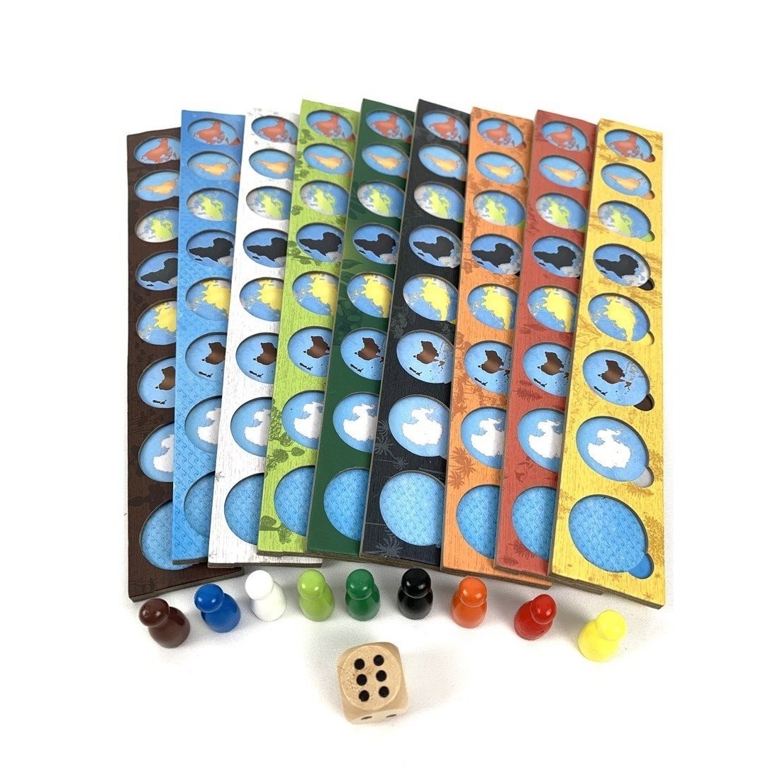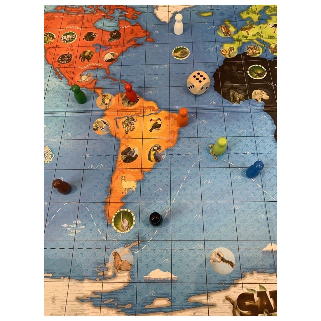 Incluye: tablero grande, fichas de animales, fichas de jugador / territorios, dado, reglas e información complementaria geográfica.