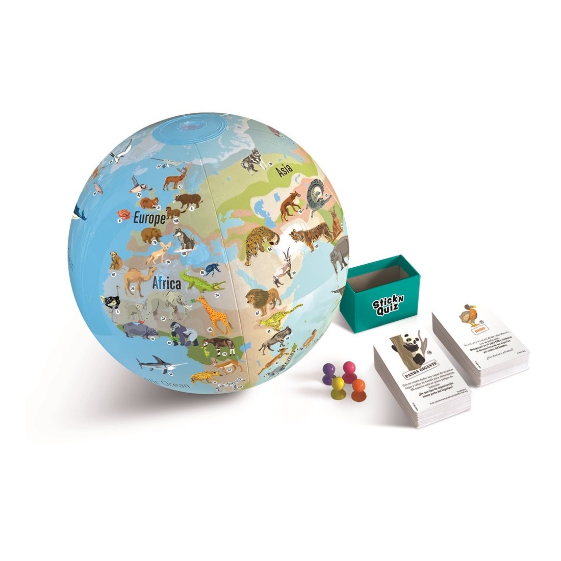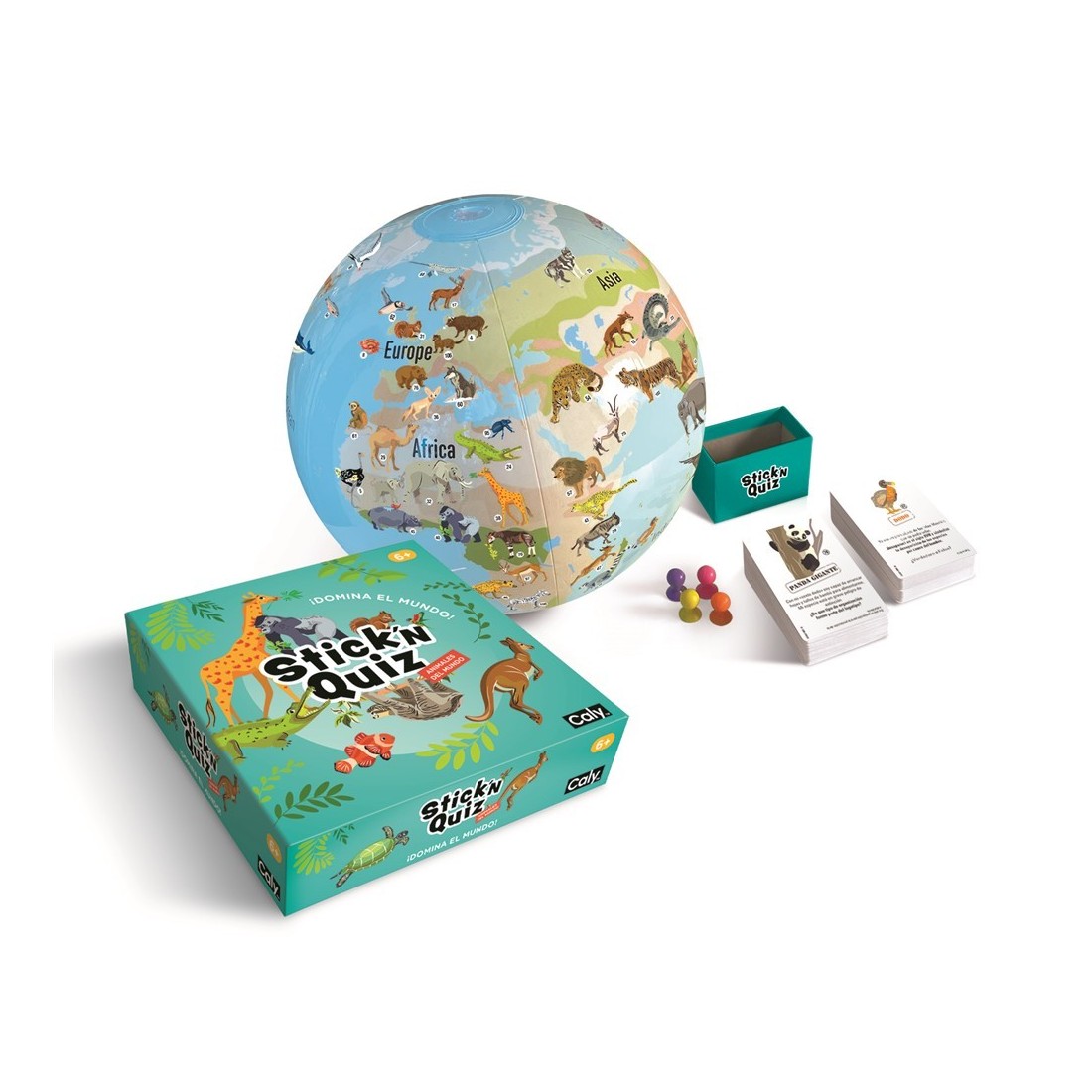 Retos de Busca y Encuentra: Lanza el globo terráqueo hinchable y usa los CalySticks para identificar rápidamente el país o continente donde viven los animales de tus cartas.