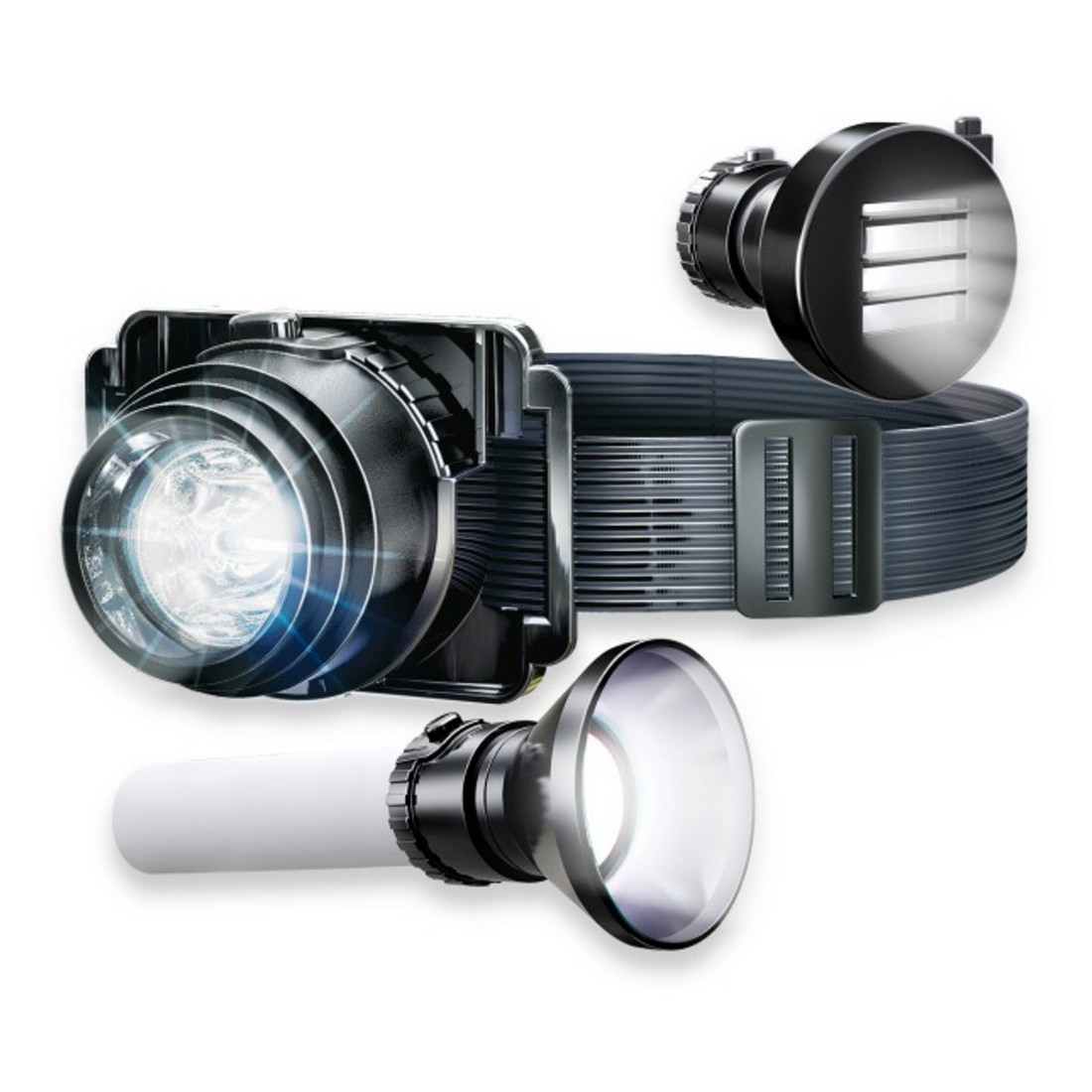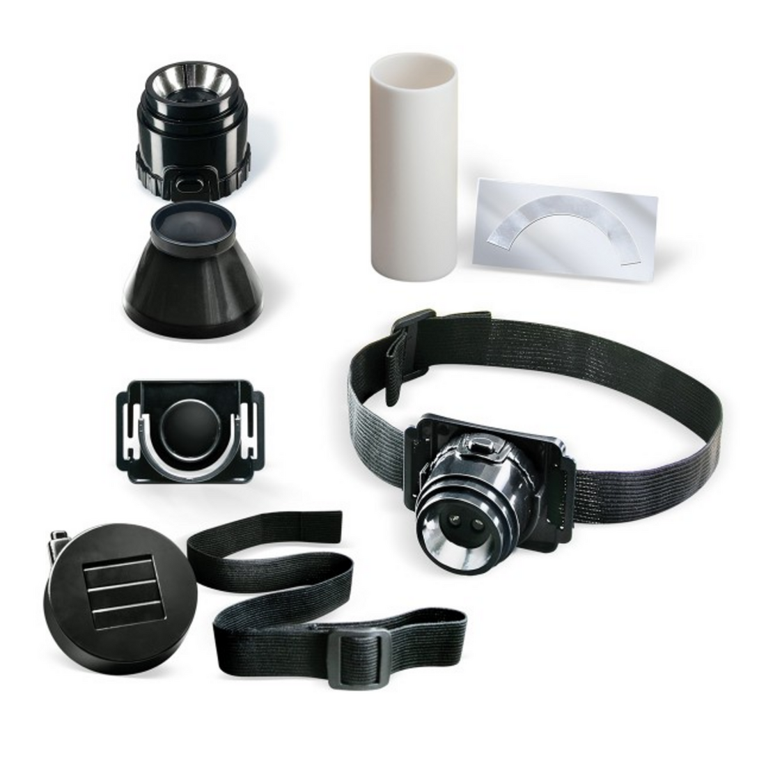 Incluye: base de luz, soporte para faros, cubierta en forma de cono, tapa de obturador, correa elástica para la cabeza con hebilla, cilindro, adhesivo plateado. También es necesario, pero no está incluido en este kit: un pequeño destornillador de cruceta.